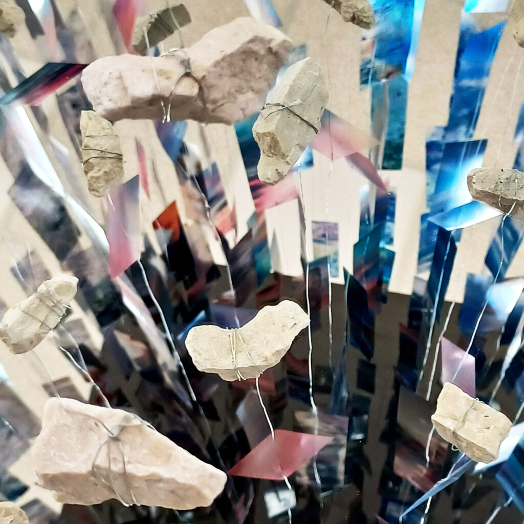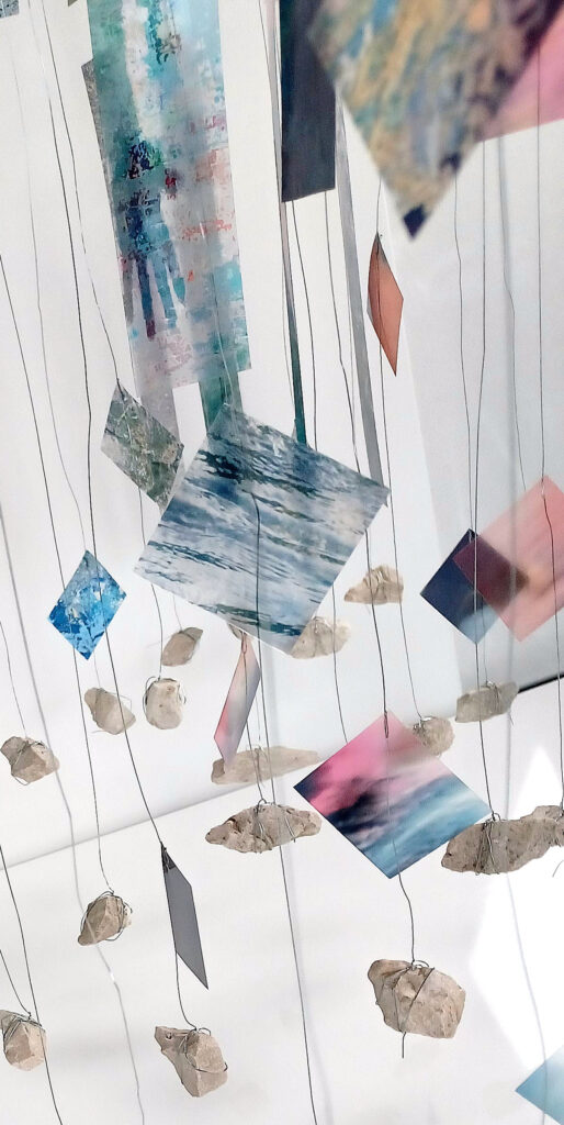 Technika: plexi, vászon, huzal, fotó-fóliaprint, kő, tükör