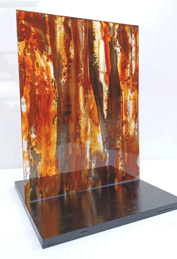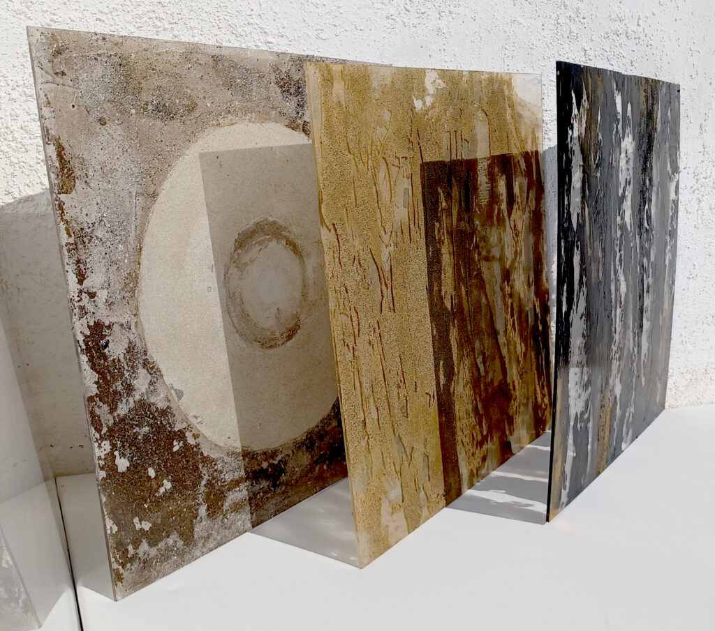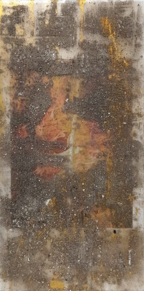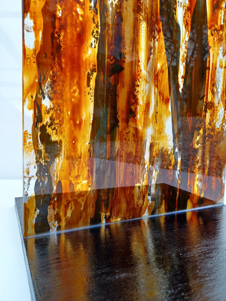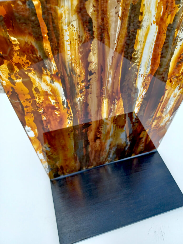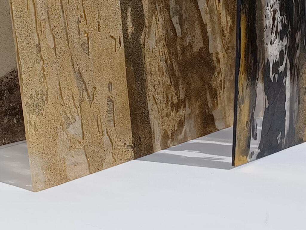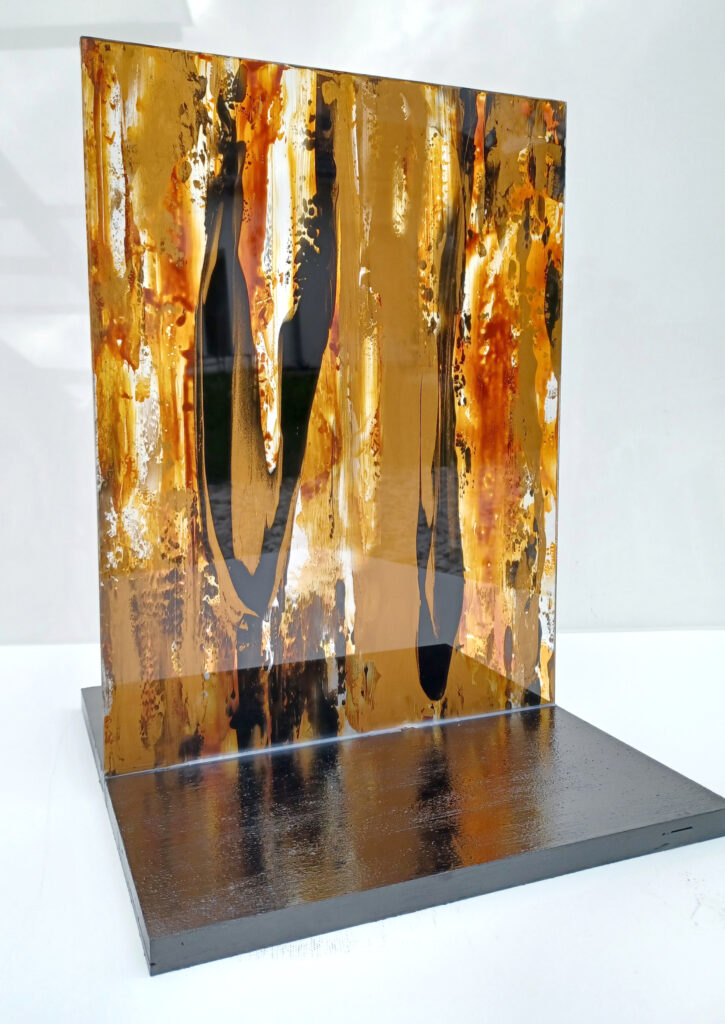 Technika: ásványpor, hamu, akril, arany pigment, plexi
