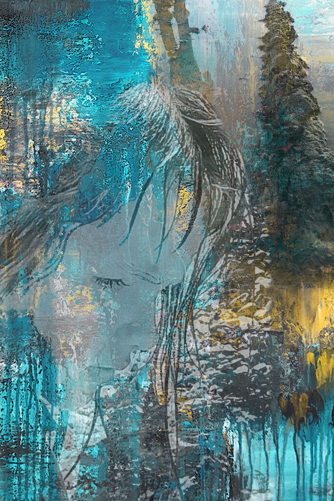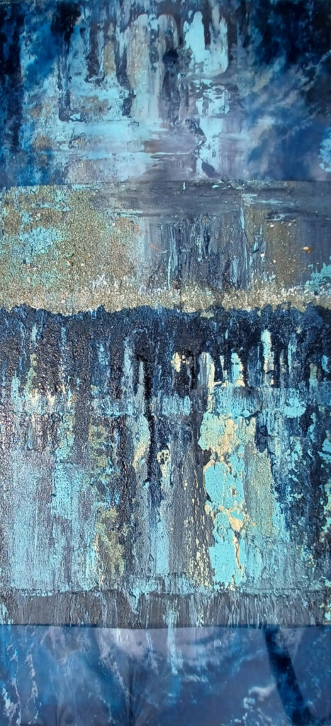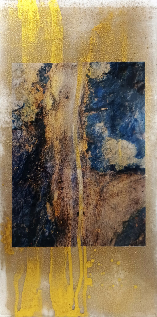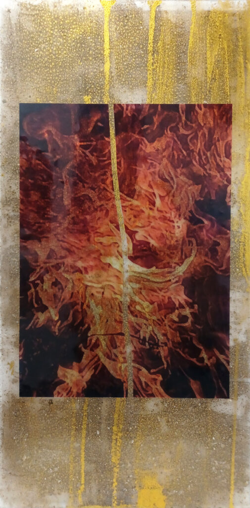 Technika: farost, akril effekt, üvegfesték, arany pigment, ásványpor, fólia print, lakk, ezüst képkeret, üveg Méret: 52,5×25,5×3 cm