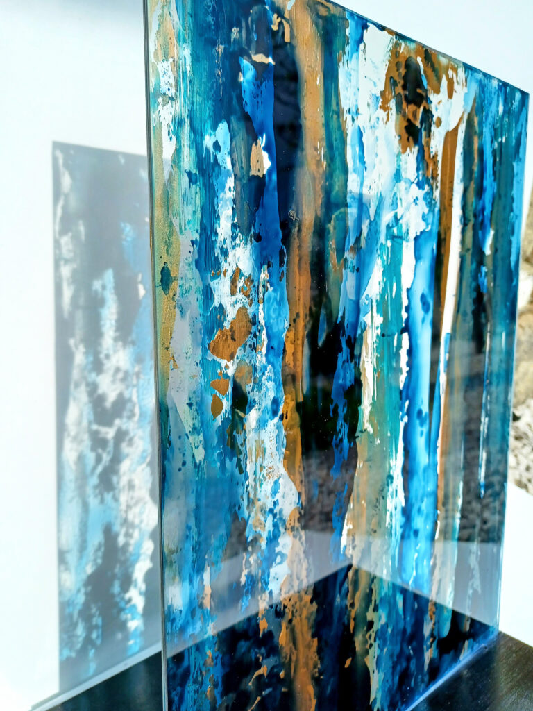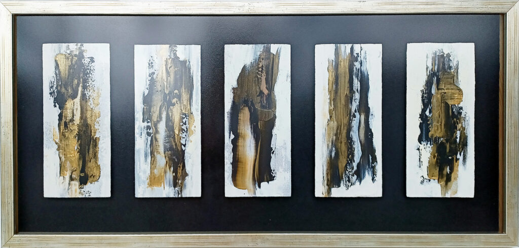 Technika: egyedi vegyes technika – plexi, arany pigment, ásványpor, fólia print, lakk, arany képkeret, üveg