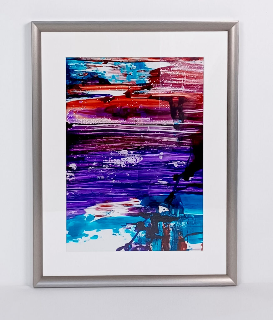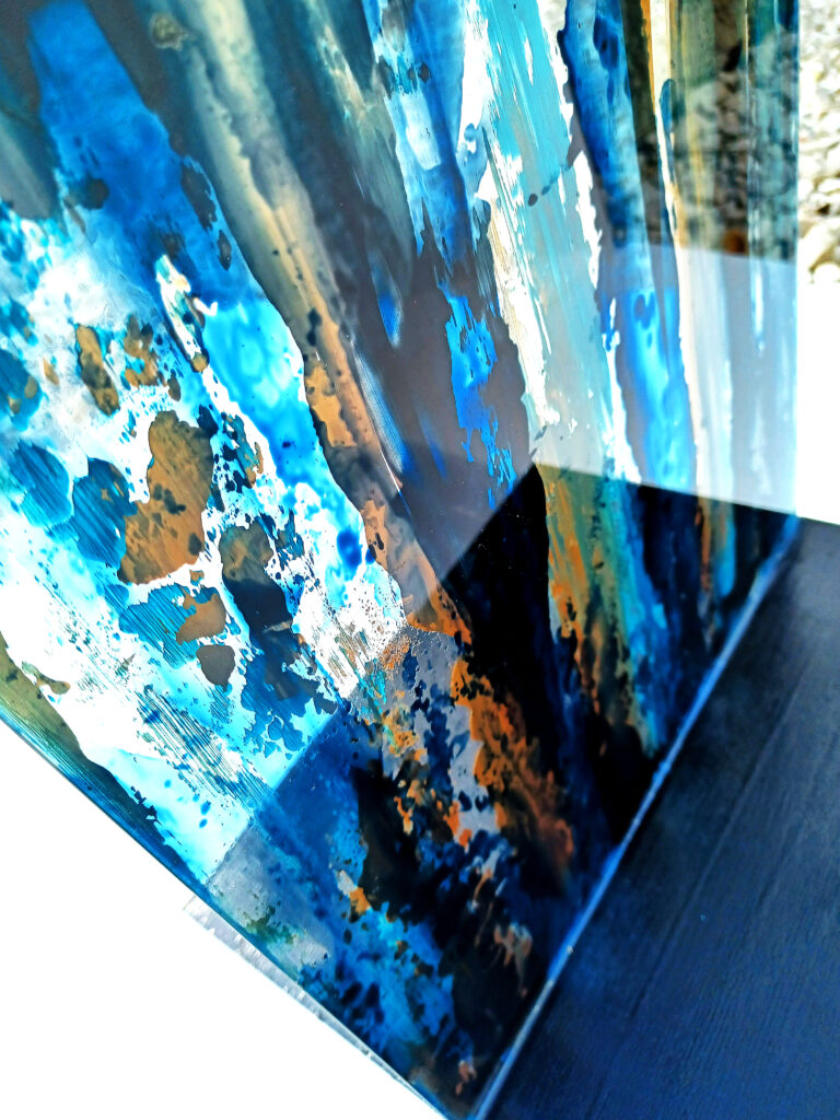 Technika: polisztirol lemez, egyedi vegyes technika, digitális fólia print, alumínium képkeret, üveg