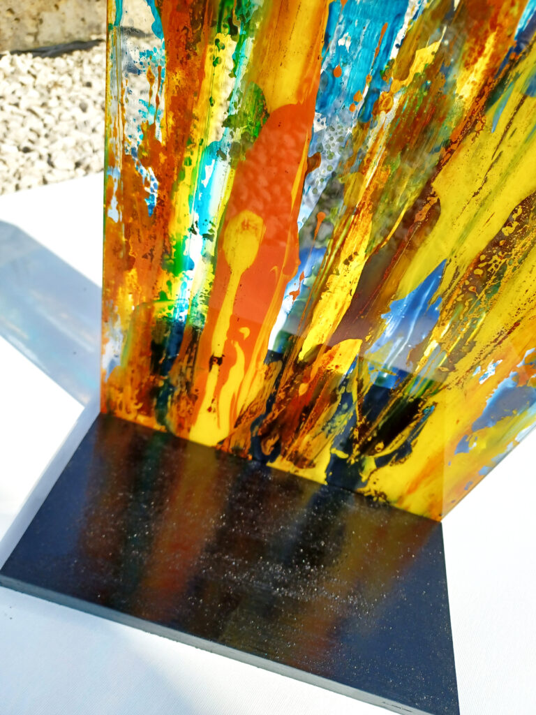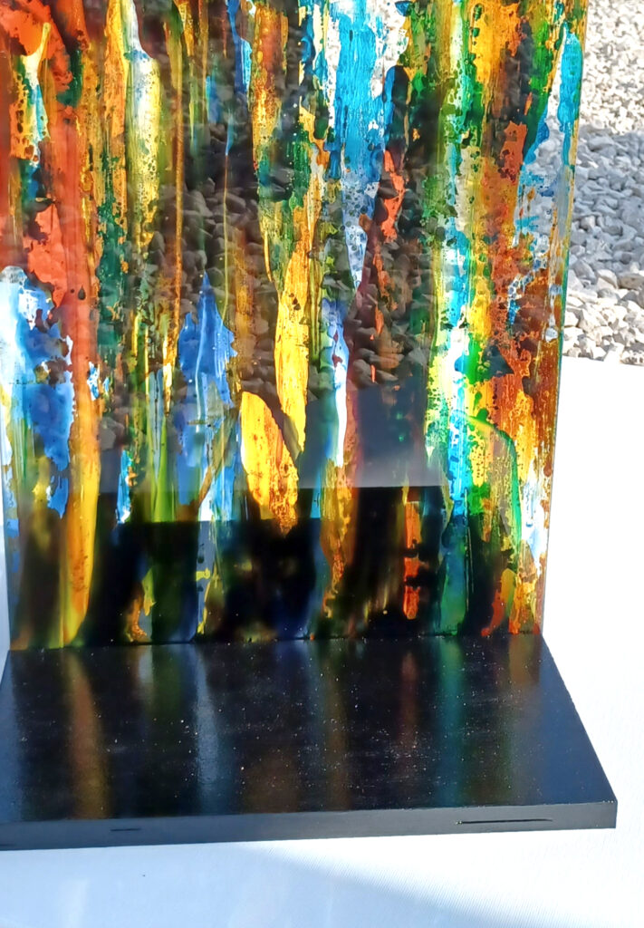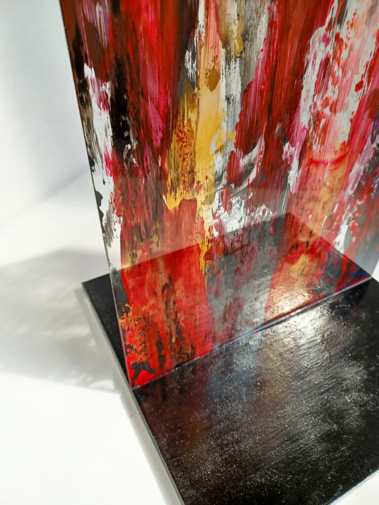 Technika: egyedi vegyes technika,üveg, festett fa / fém posztamens